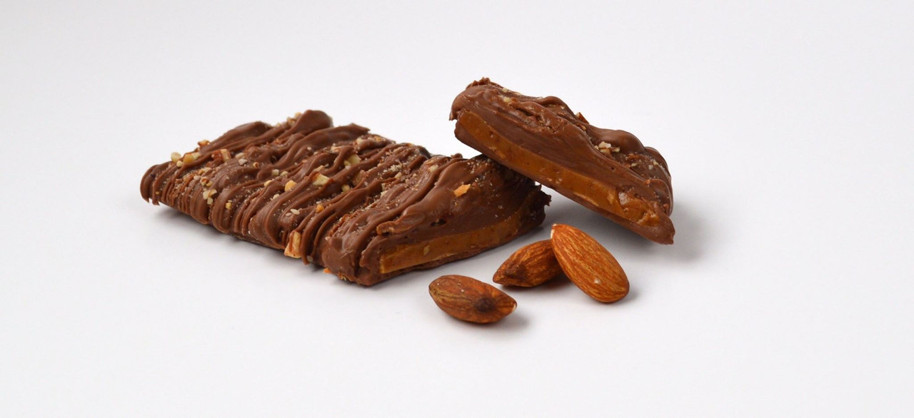 Our toffee is cooked until the almonds are roasted to perfection, then enrobed in Belgian Milk Chocolate.